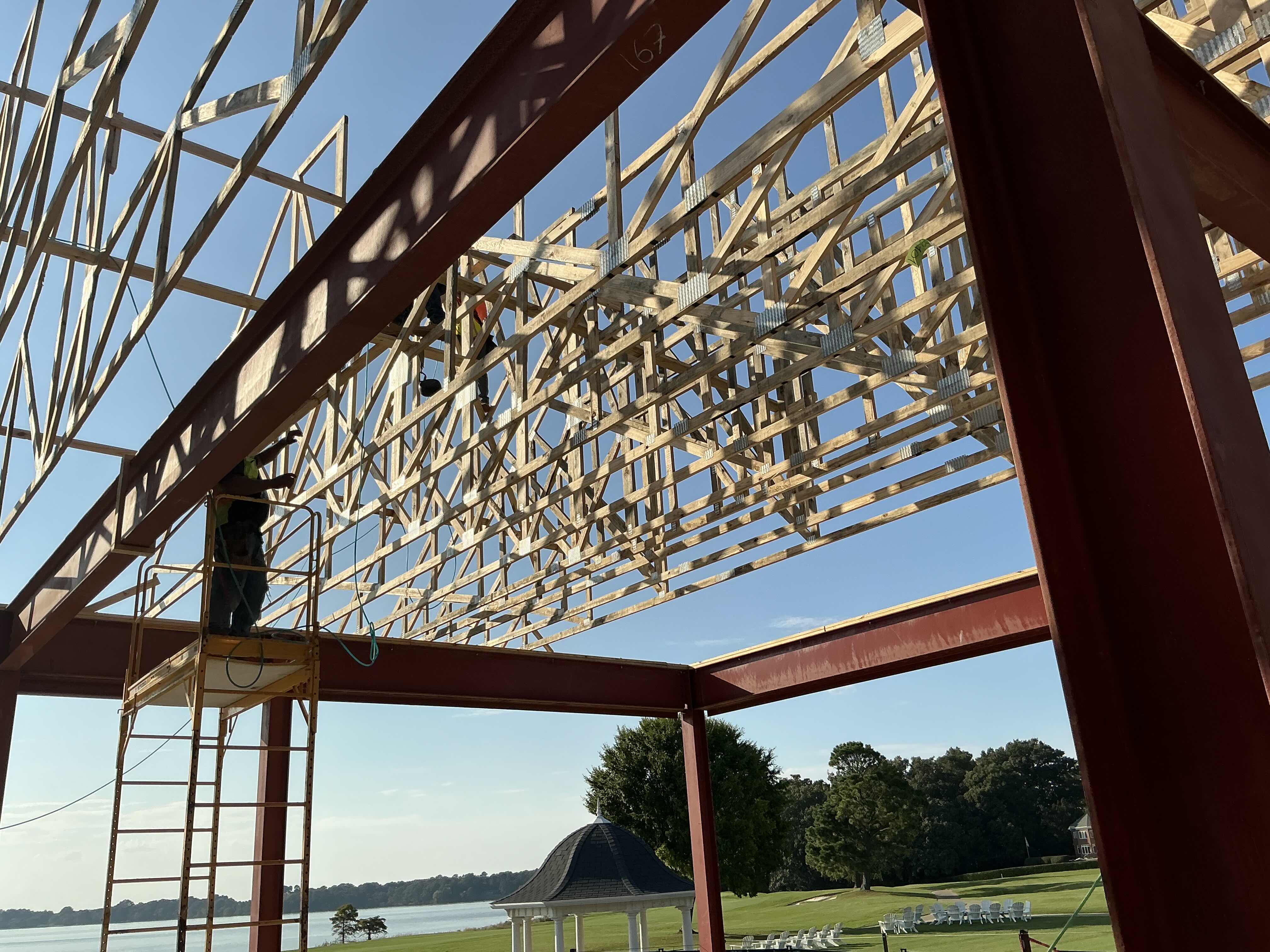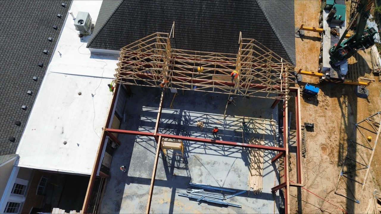 Under Division 06 – Wood, Plastics, and Composites, ECC’s scope included the design, fabrication, and installation of all engineered wood roof trusses, soffit and cornice framing, OSB sheathing, and soffit fireblocking. Structural tie-ins were completed to integrate new framing with existing assemblies, using all required connection hardware, hold-downs, and fasteners to ensure a complete and compliant system. ECC also furnished and installed composite columns at all new locations in accordance with architectural design intent.
